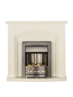 The surround boats satin ivory styling that exudes simple elegance, combined with a brushed steel fire for a contemporary touch.