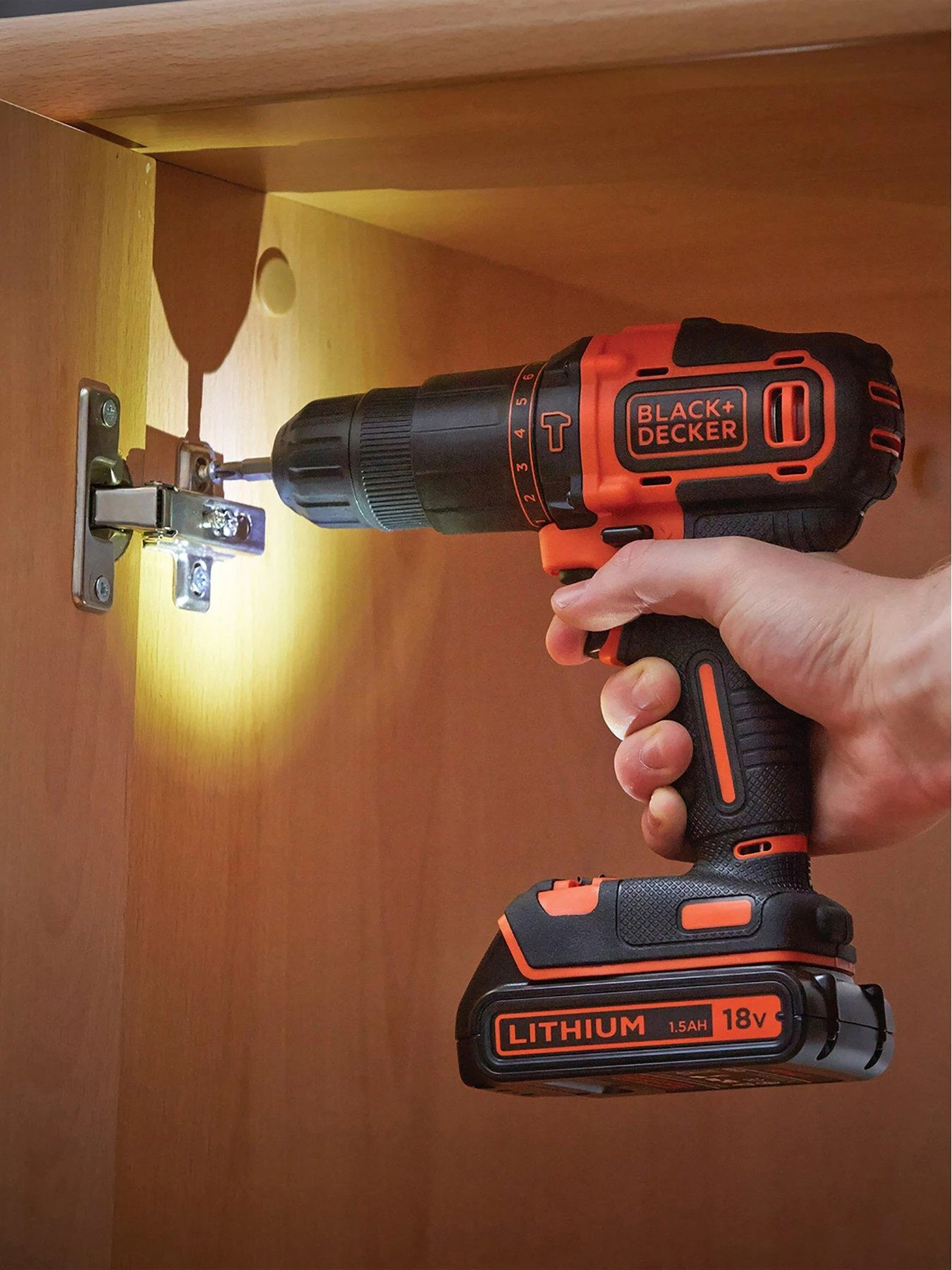 Black & Decker 18V 2-Gear Cordless Hammer Drill with Toolbox and 104-Accessory Set – a must-have for any DIYer’s tool kit.