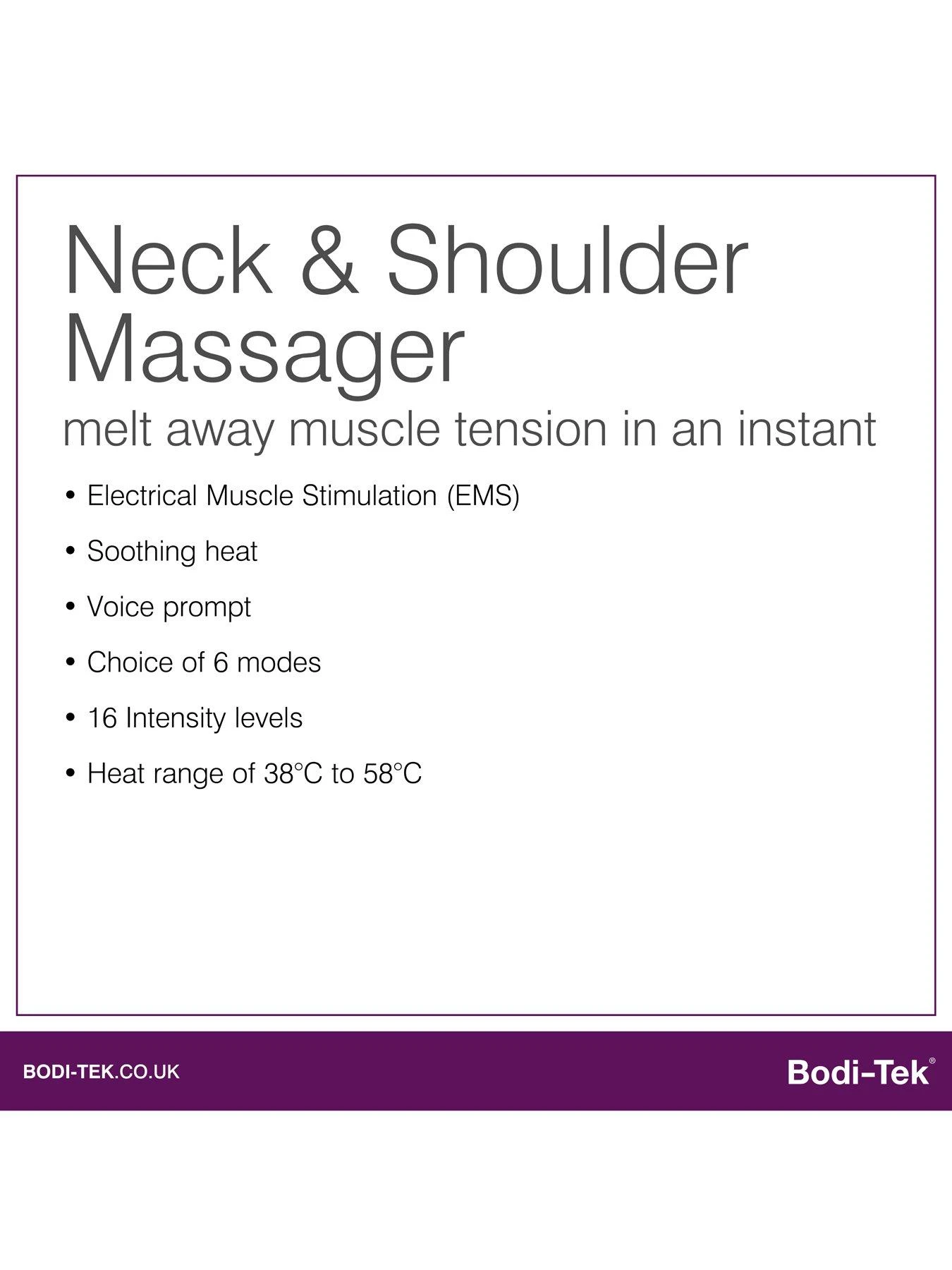 The Bodi-Tek Neck & Shoulder Massager helps relieve neck/shoulder stress and muscle tightness with combined relaxing electrical muscle stimulation and gentle soothing heating.Â