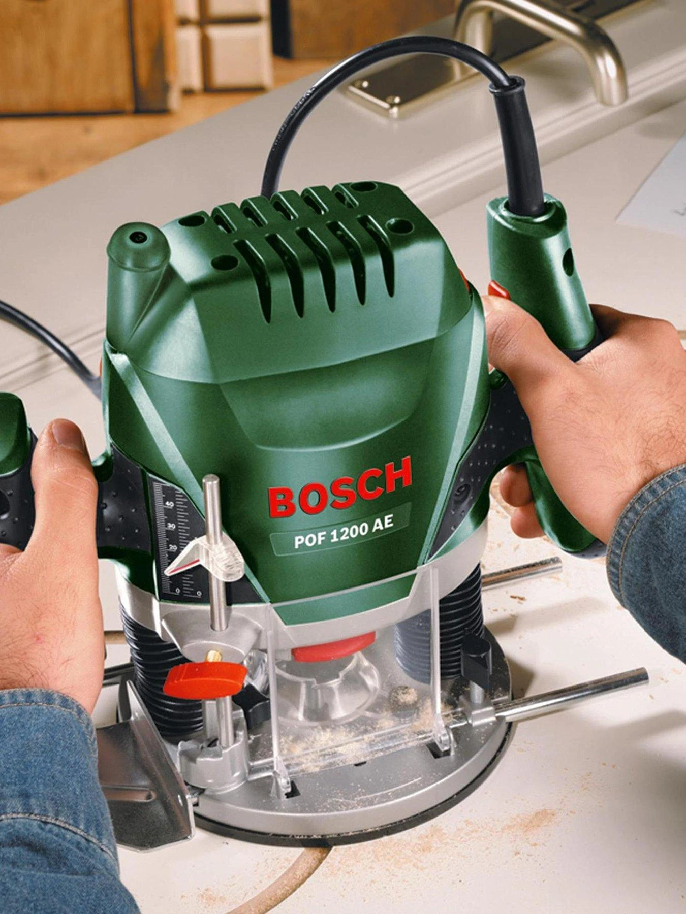 The POF 1200 AE router enables DIYers to rout grooves, edge profiles or even special mouldings – always with maximum precision and convenience. The powerful 1200 watt motor enables the most demanding projects to be done and ensures a continuous work rate.