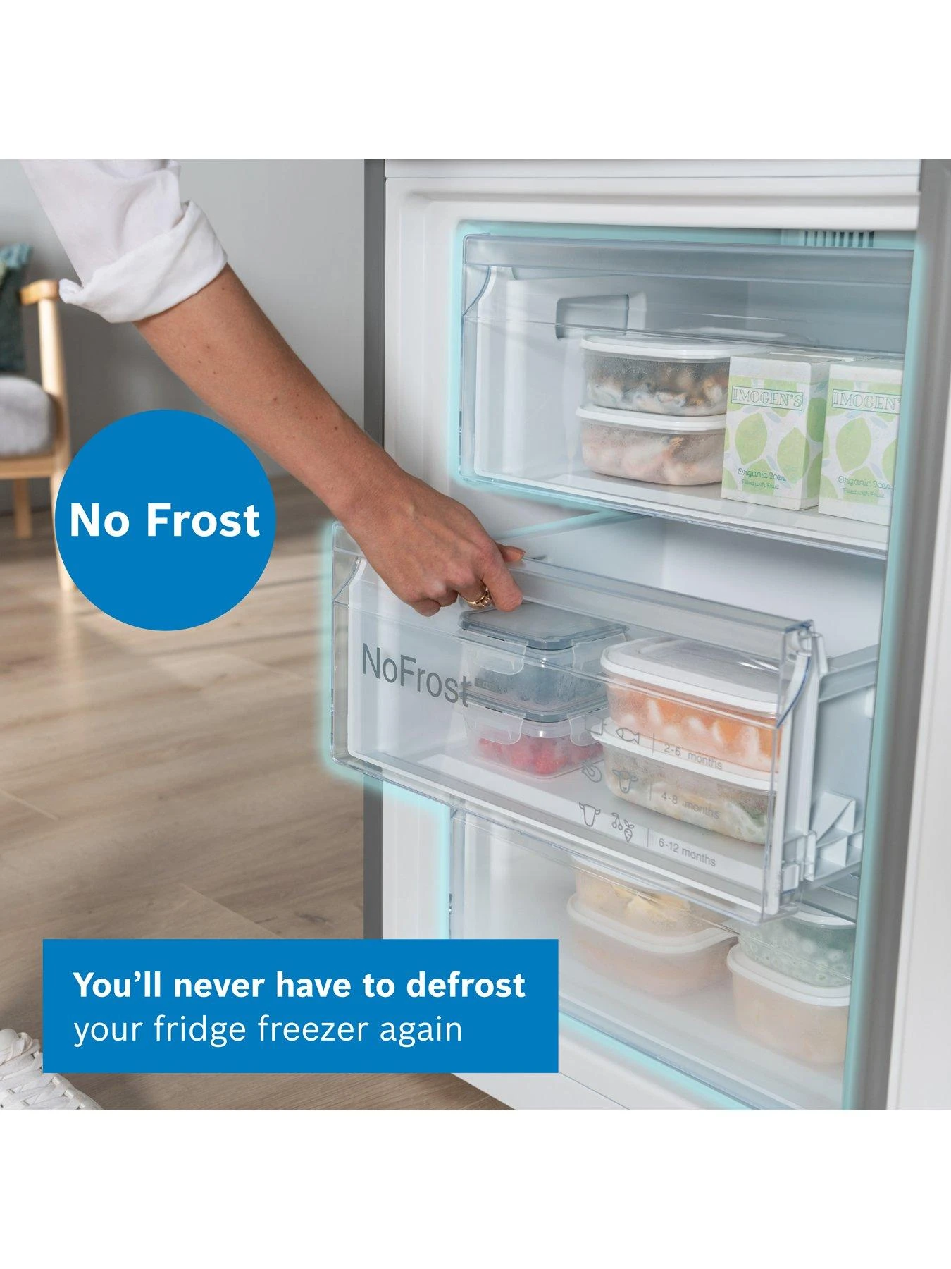- NoFrost – No need to defrost your fridge-freezer.
