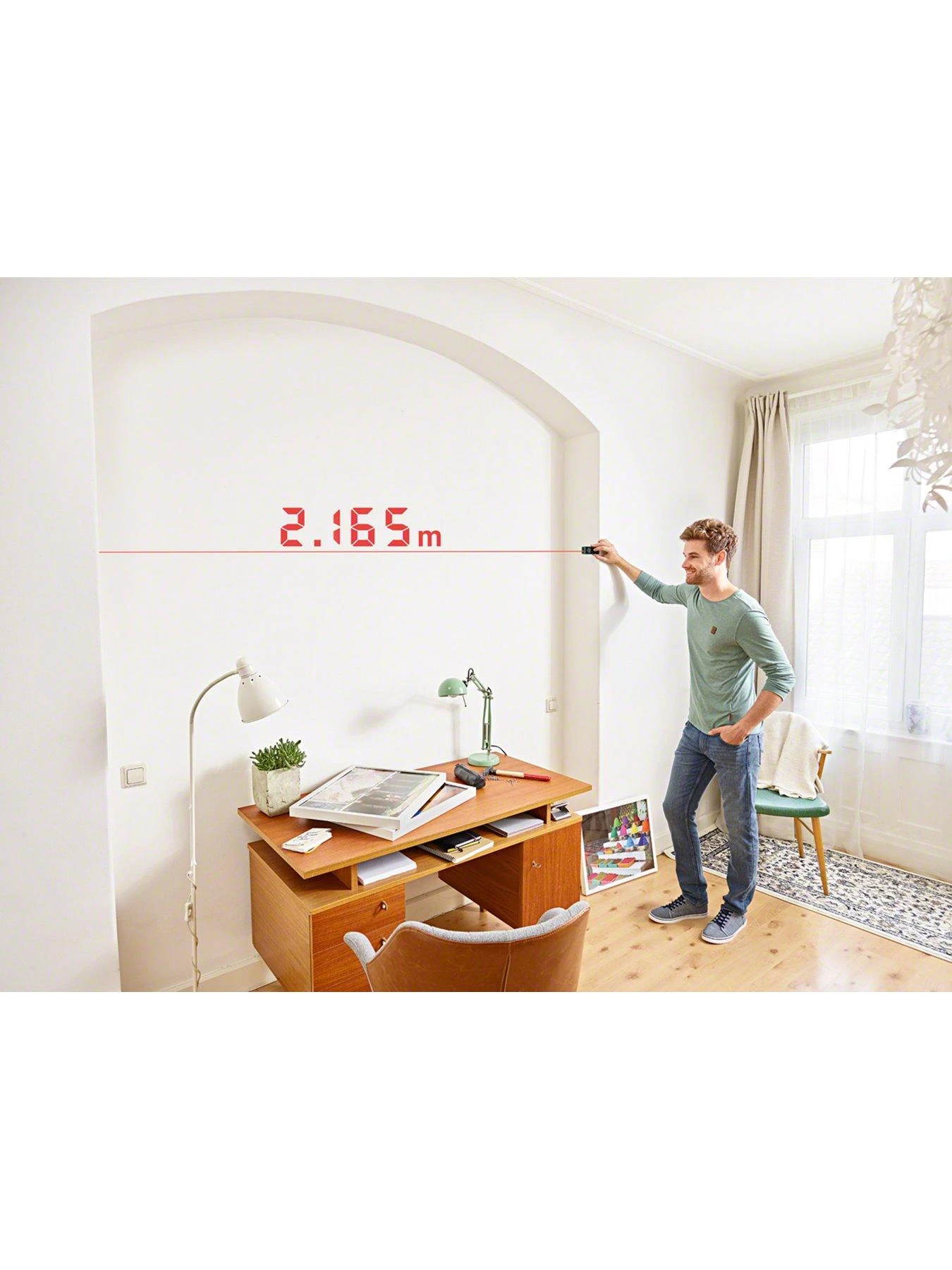 - For measuring distances, objects and areas as well as aligning objects on a wall