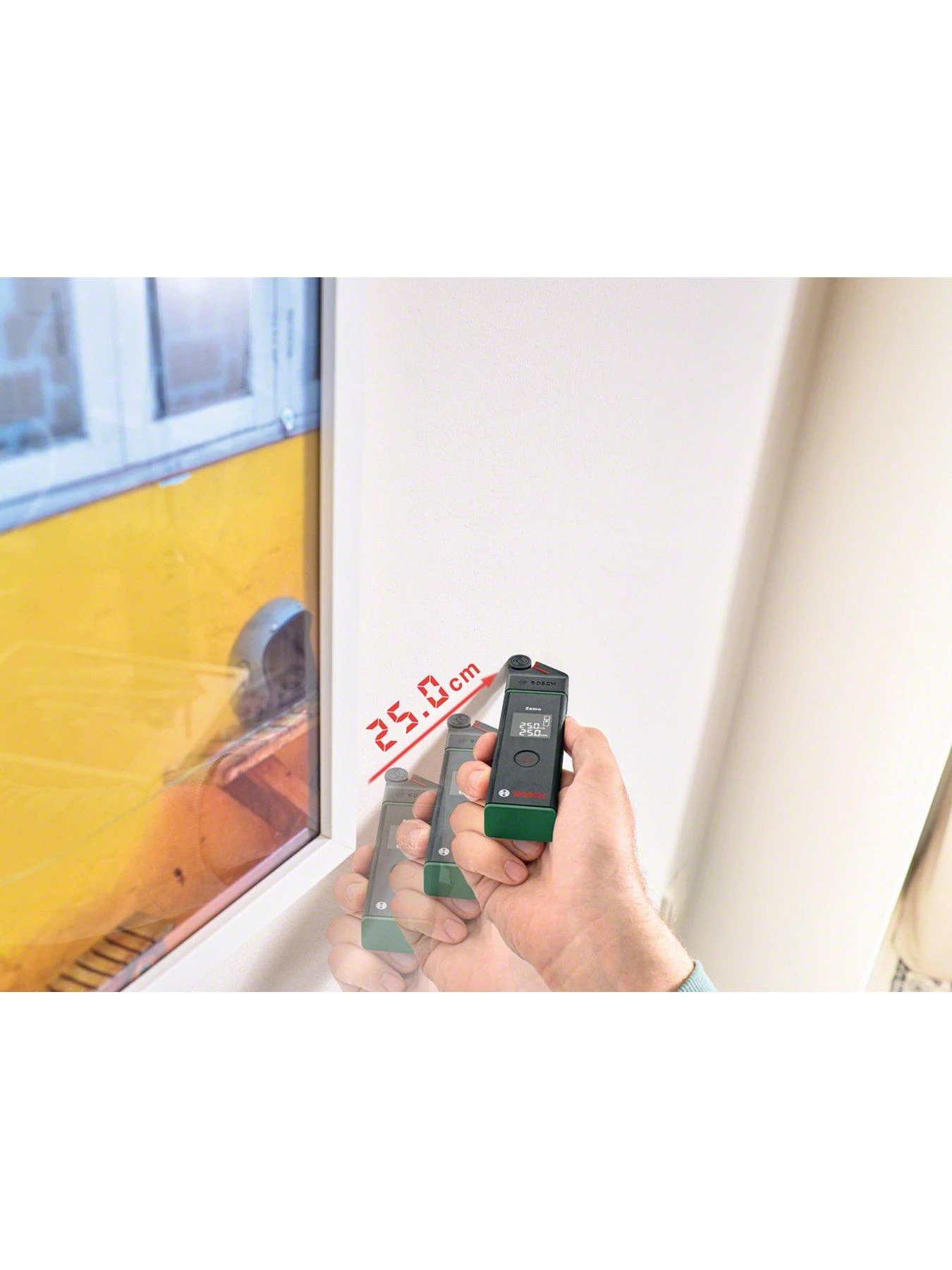 Laser technology achieves high levels of accuracy for distances up to 20m. The Zamo Set integrates three practical, Bosch-patented adapters for a wide range of projects: A wheel adapter easily measures curves and irregular surfaces, while the line adapter is perfect for levelling objects.