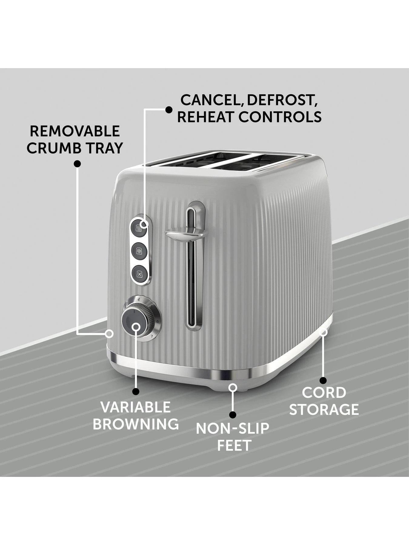 - Defrost, reheat and mid-cycle cancel functions, plus removable crumb tray, non-slip base and cord storage.