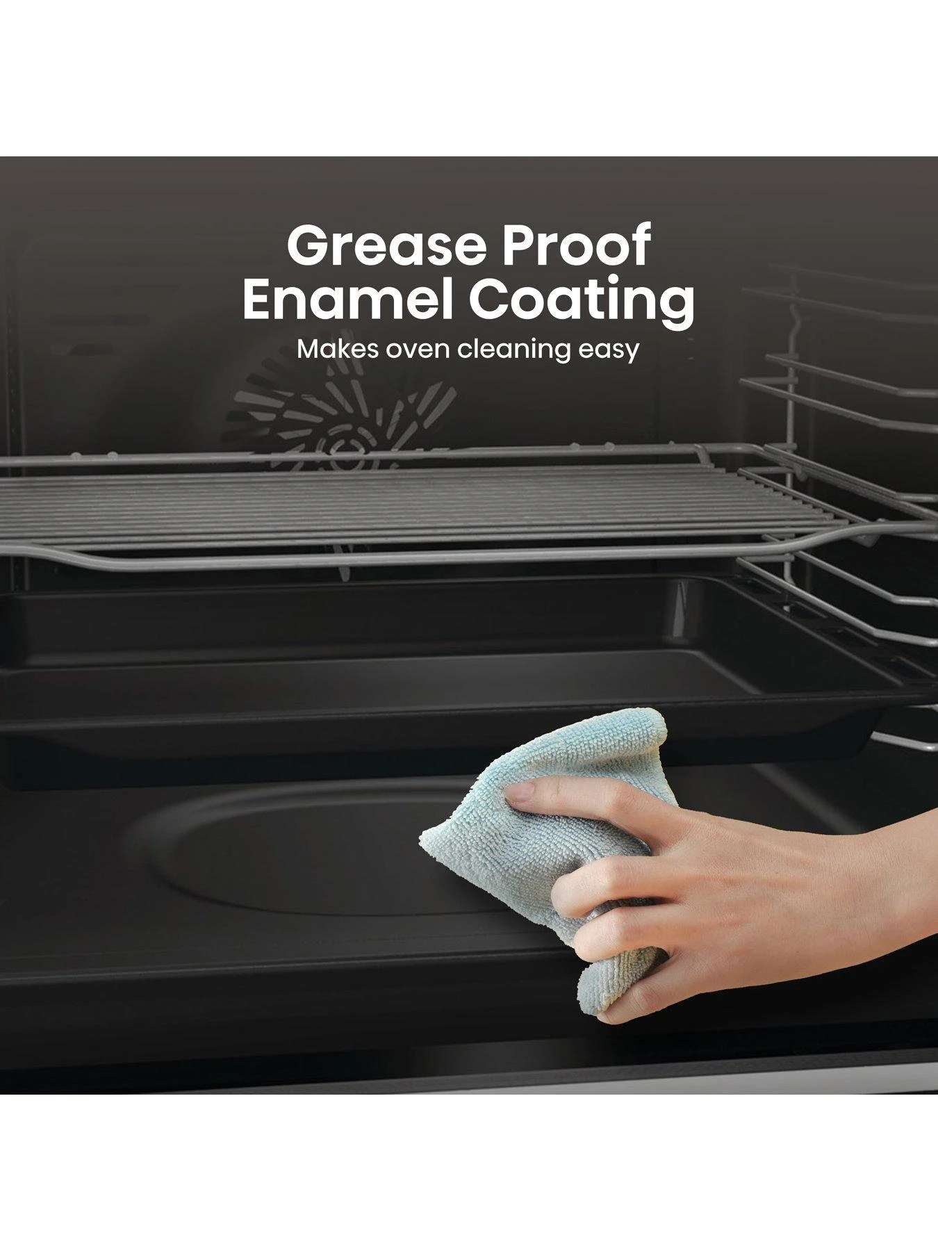 - Grease-proof enamel coating makes oven cleaning easy