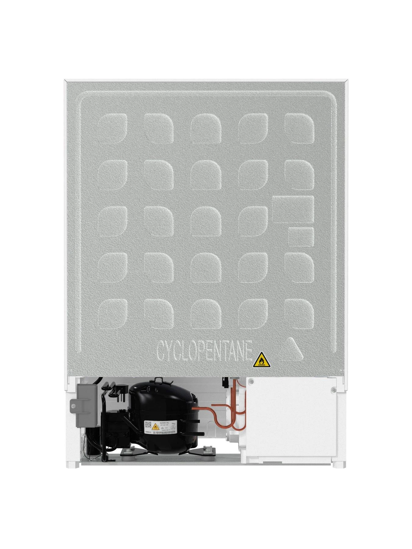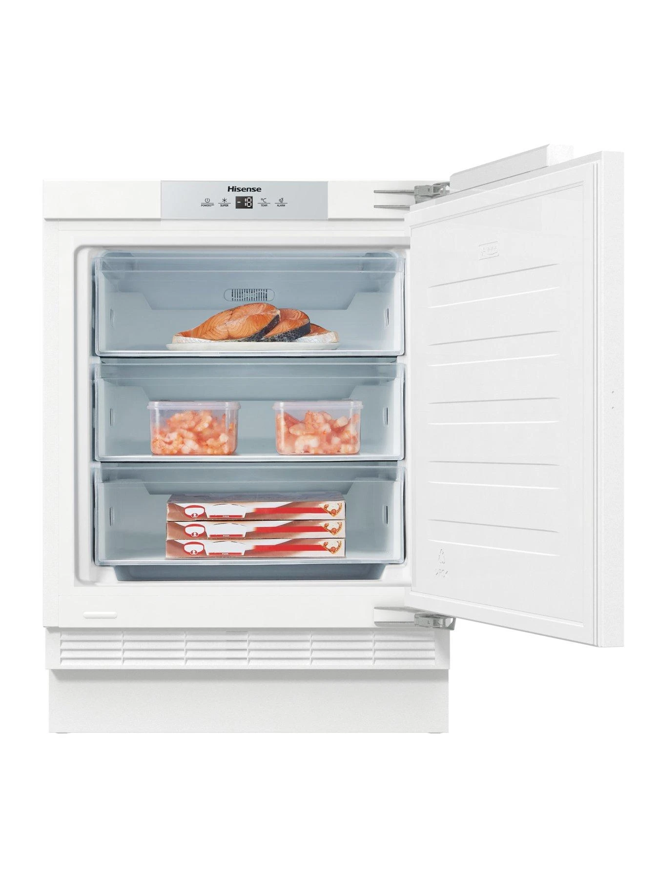 This Hisense built in freezer is designed to fit under your kitchen worktop and comes with a fixed door fixing kit. The 101-litre capacity can hold up to 5 bags of food shopping spread across 3 drawers. The transparent fronts mean you can quickly find what you’re looking for without letting too much warm air in.