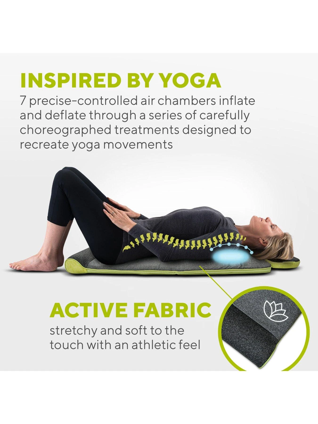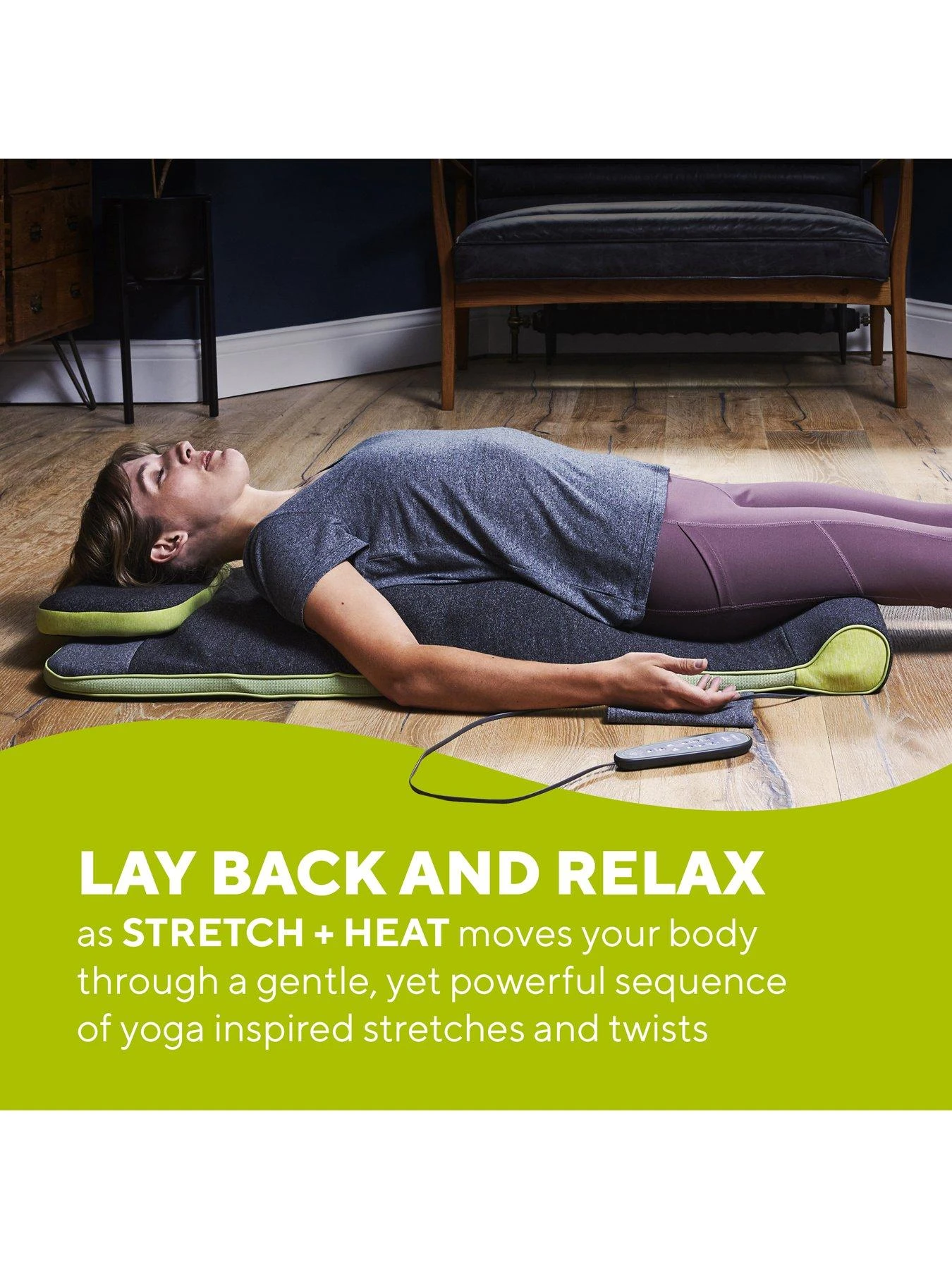 The Homedics STRETCH + HEAT Mat leads the body through a series of carefully choreographed treatments designed to recreate yoga-inspired movements by inflating and deflating 7 air chambers.