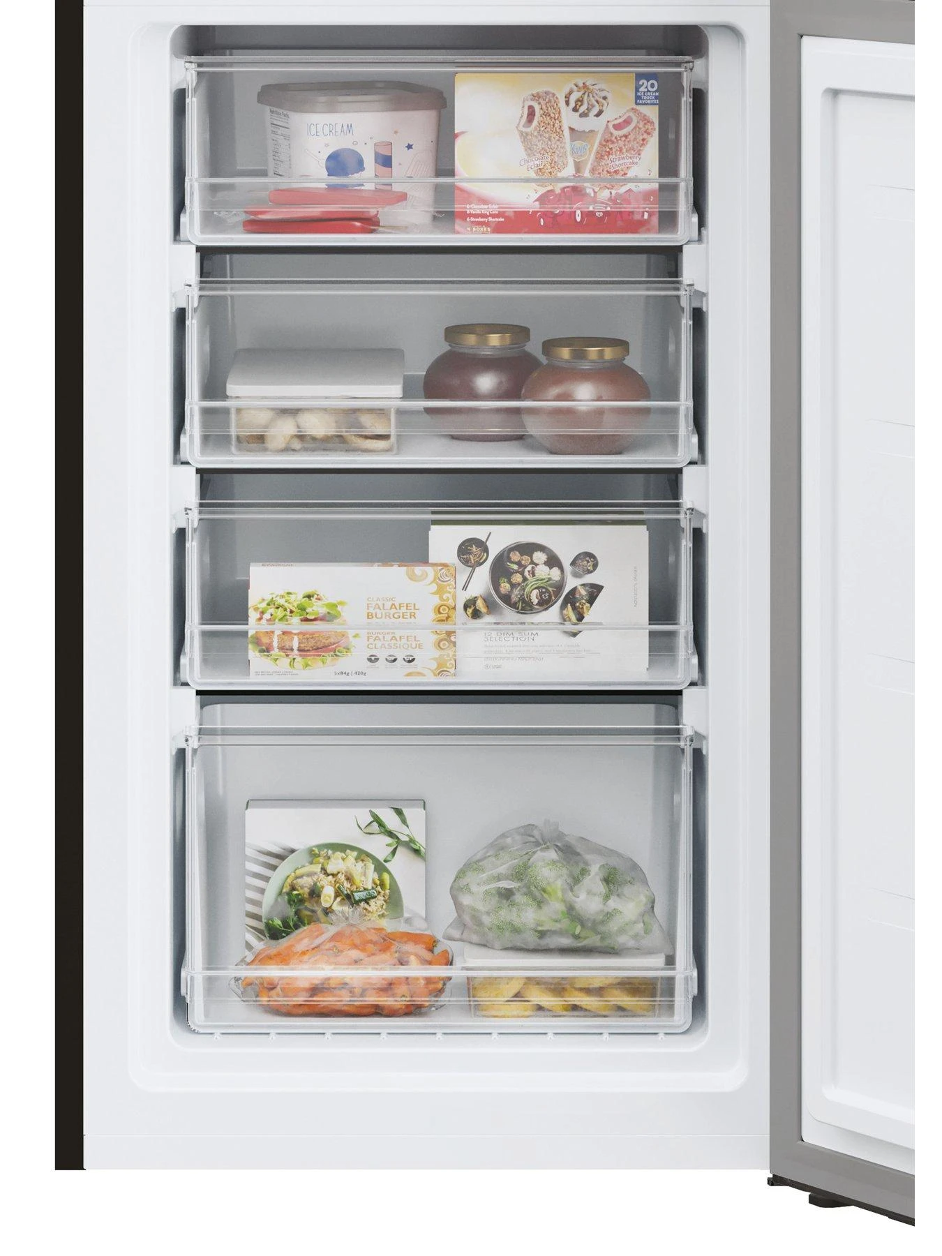 The freezer compartment has a 101 litre capacity and has four transparent drawers, giving you full visibility and easy access to the contents.