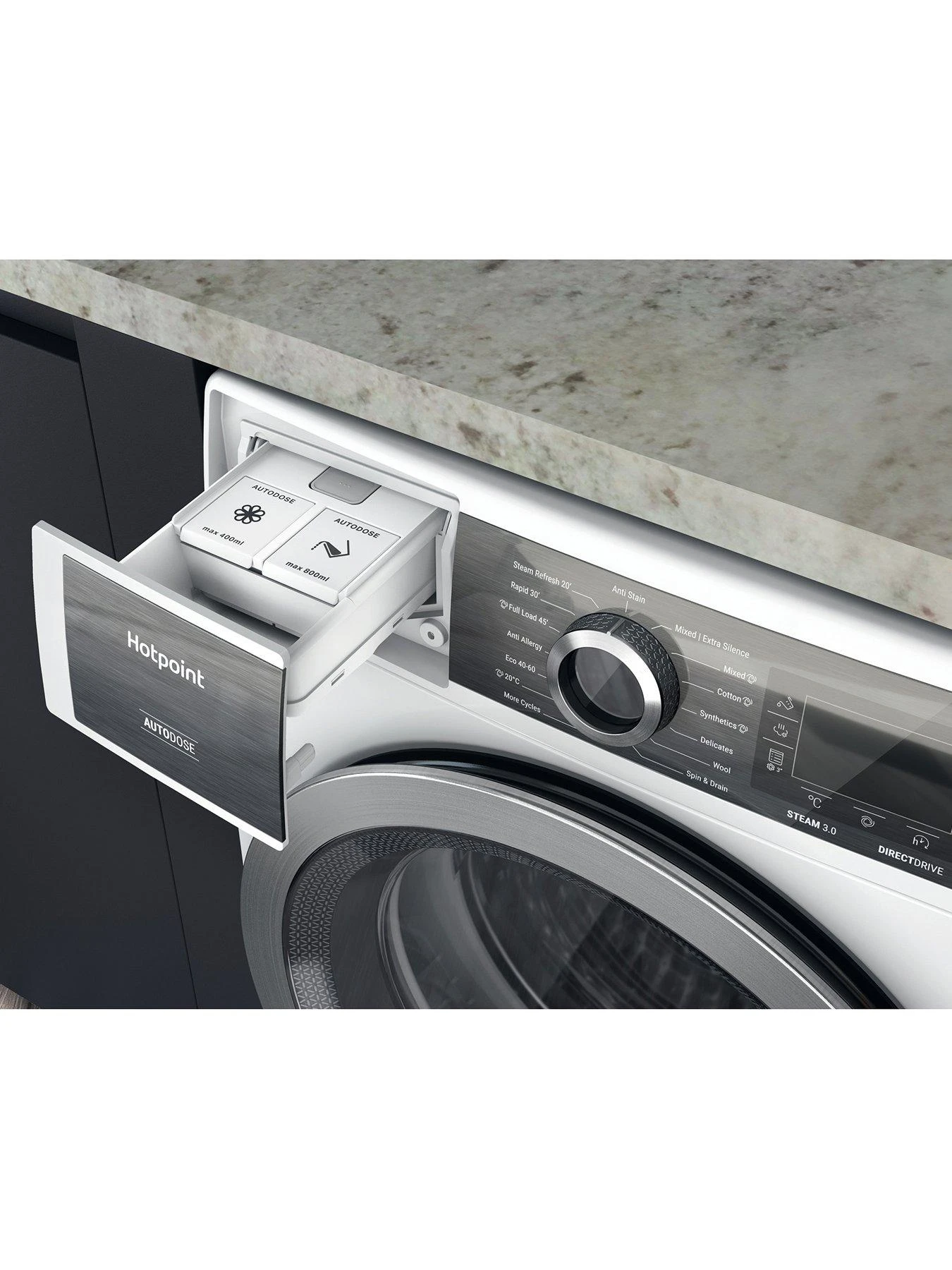 Optimise your cycles with Autodose, which controls the amount of detergent used, dispatching the perfect amount for every cycle so you can wash multiple loads without the need to refill.