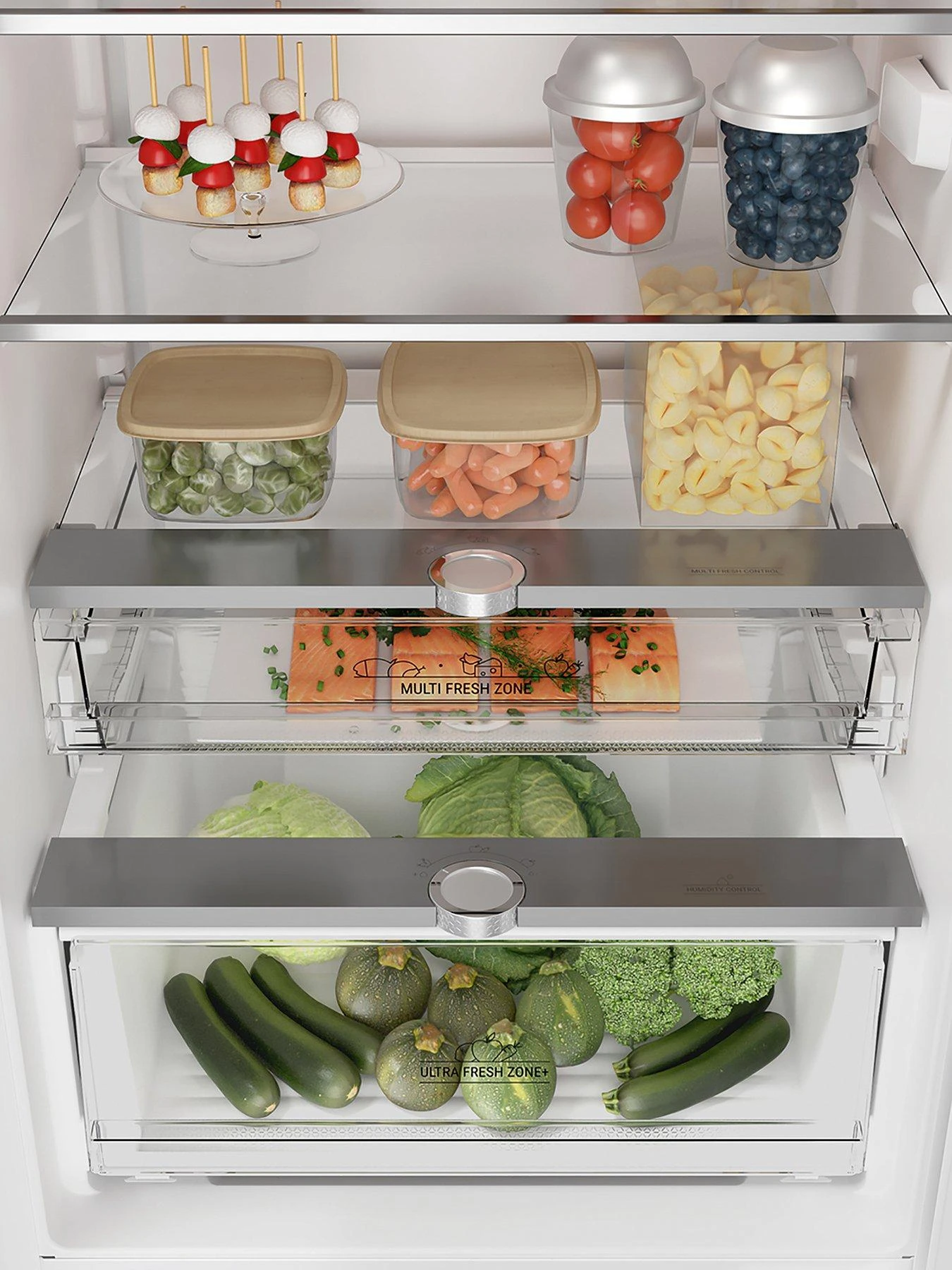 The large fridge section features 3 adjustable safety glass shelves, a bottle rack, 6 door balconies and an Ultra Fresh Zone+ sealed drawer with humidity selector which preserves the freshness of your fruit and veggies for up to 15 days.