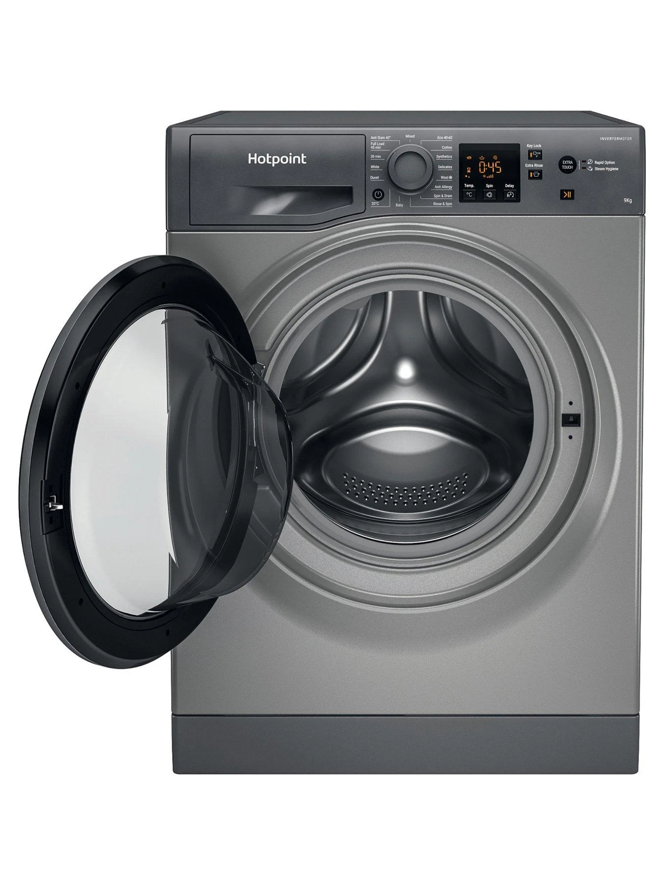 The Hotpoint NSWM945CGGUKN also features a Full Load 45″ wash cycle that allows you to wash a full load of laundry in just 45 minutes, without it compromising on the washing performance.