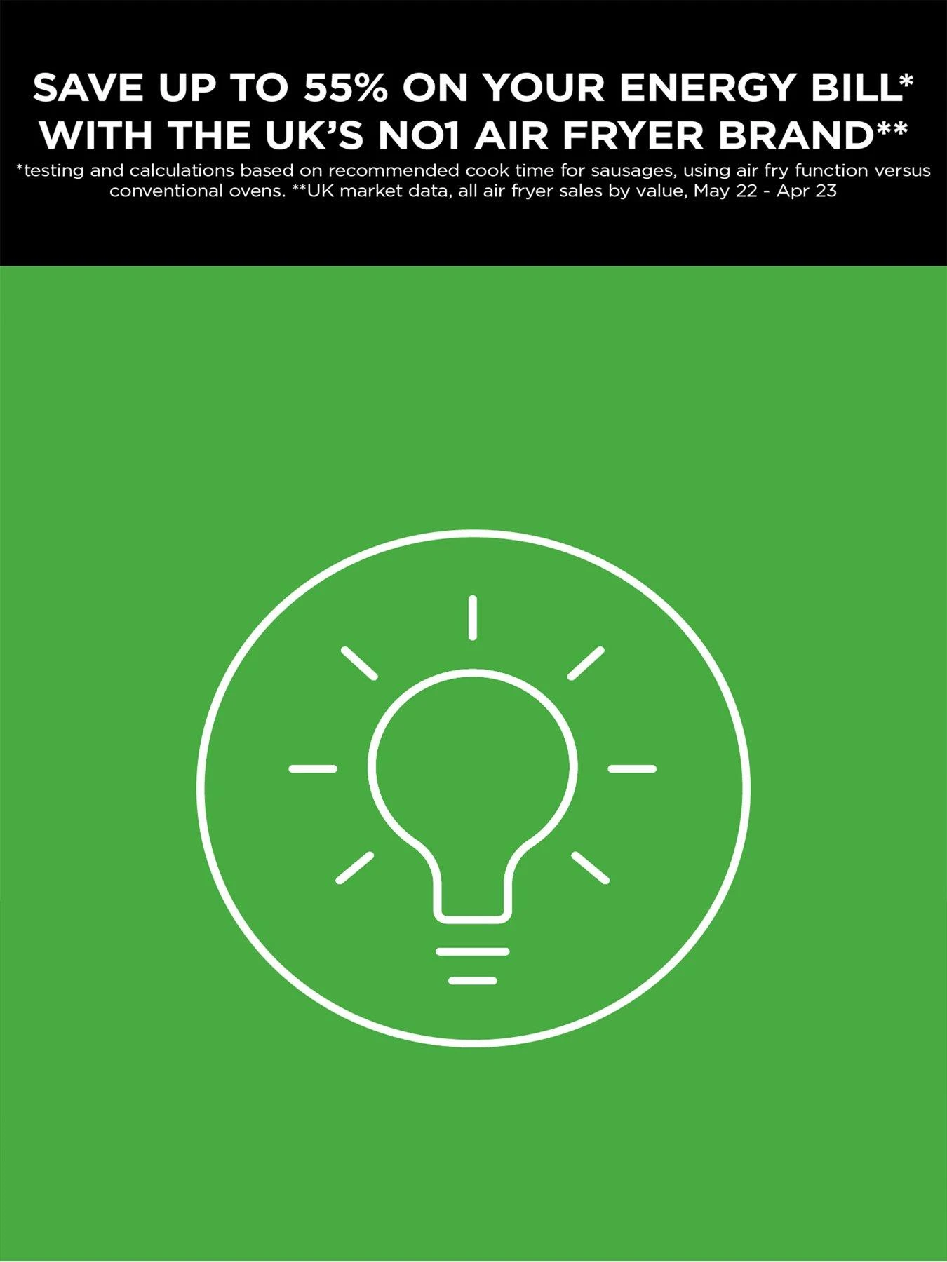 Feed the family with the large 3.8-litre non-stick basket, fitting in 900g of chips – that’s equal to 6 servings. Dinner can be on the table in just minutes thanks to the Air Fryer’s quick, customisable programmes, sleek touchscreen controls and fast air-flow.
