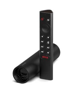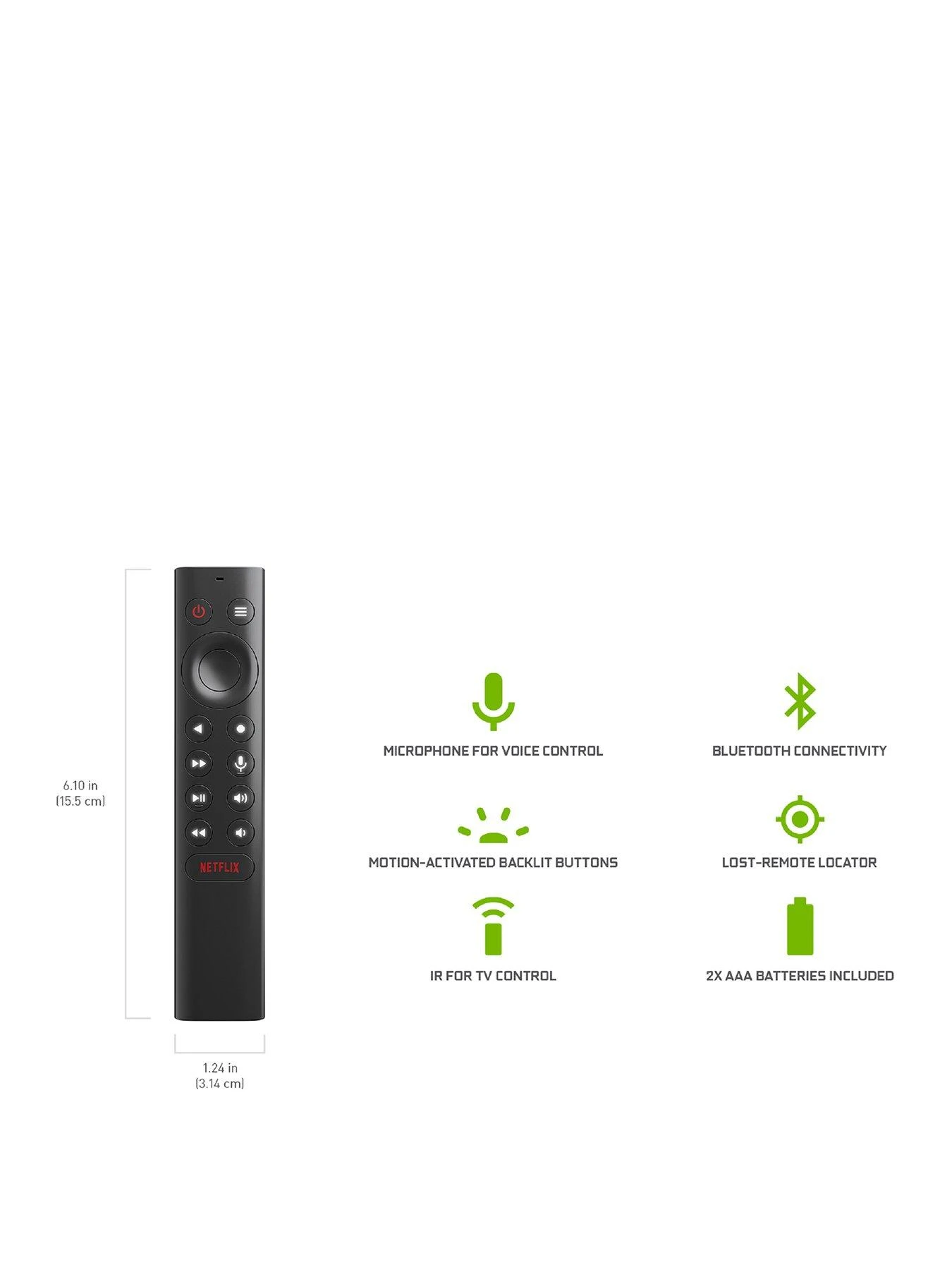 - Mircophone for voice search and commands; backlit buttons; IR for control of TVs, soundbars, or receivers; remote locator for finding a lost remote
