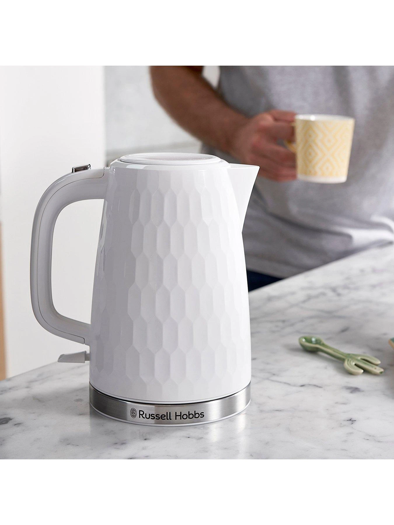 The Russell Hobbs Honeycomb Kettle in Glossy White will enhance any kitchen top.