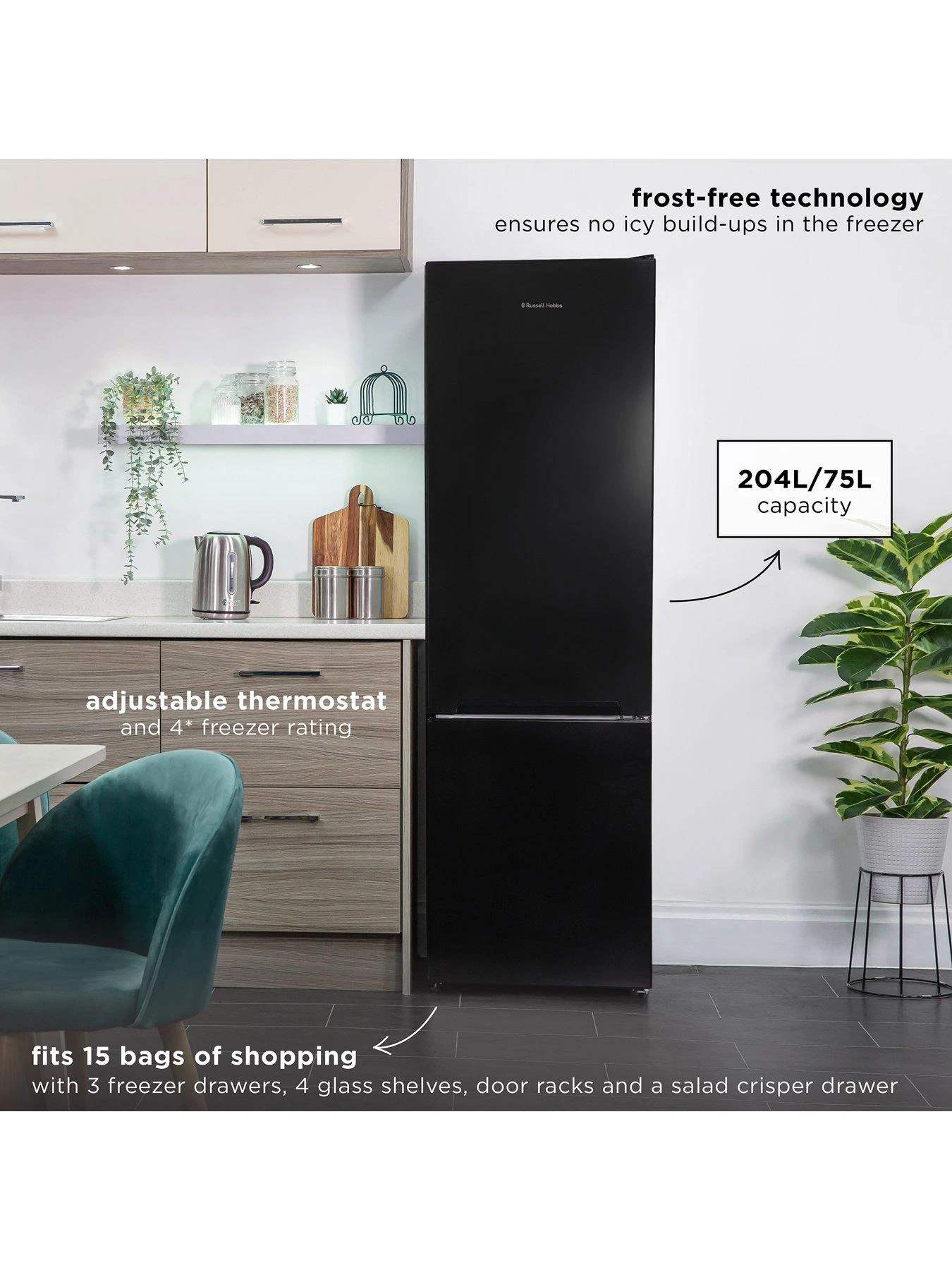 This Russell Hobbs freestanding 279L fridge-freezer is functional yet stylish, featuring a sleek black body and simple, clean design. The 70/30 split offers a generous 204L of fridge space, for up to 11 shopping bags of fresh produce and meals. The 75L freezer compartment is large enough for 4 bags of shopping, so there’s room to stock up on ice cream and store those batch-cooked family favourites.