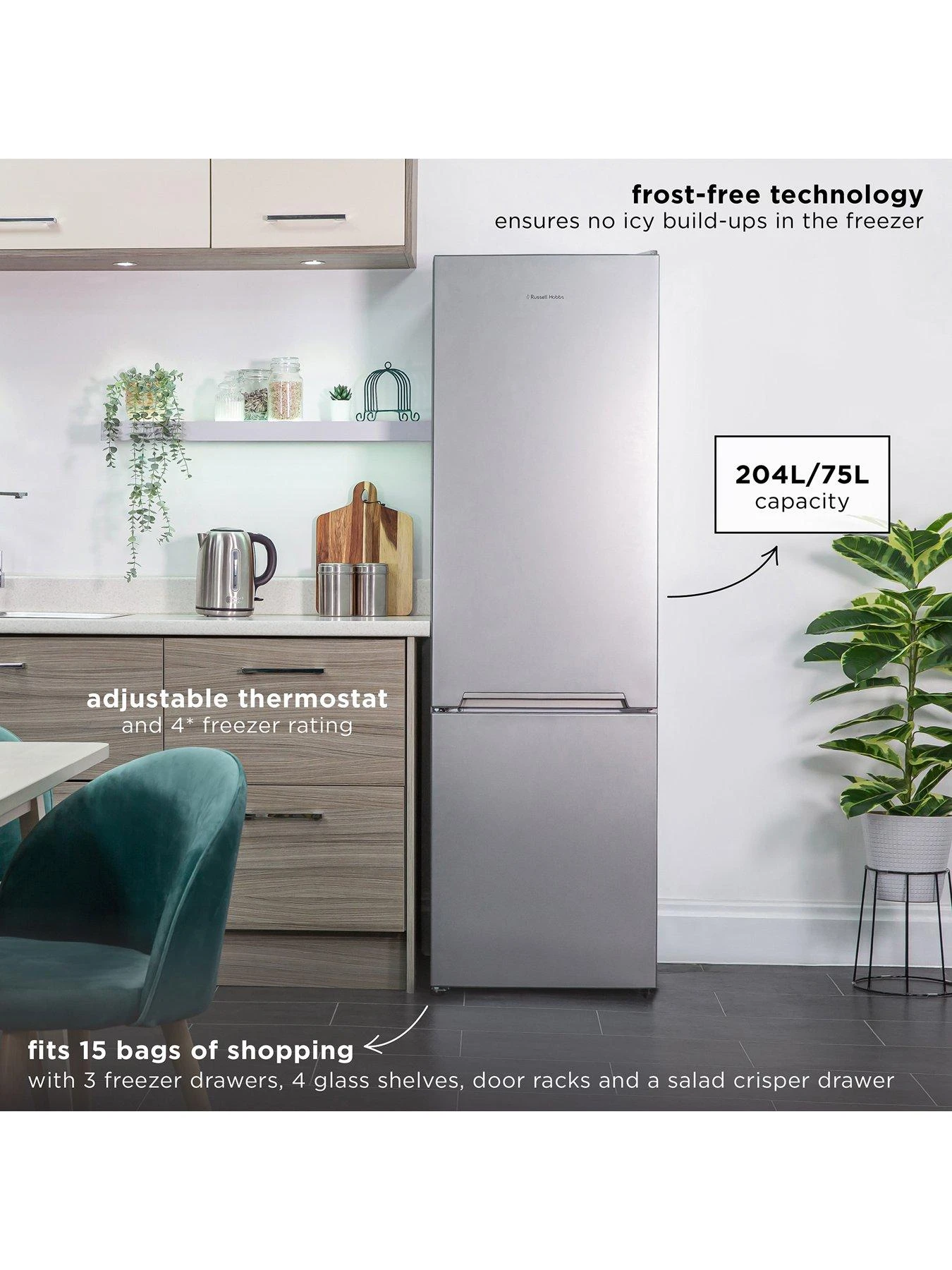 This Russell Hobbs freestanding 279L fridge-freezer is functional yet stylish, featuring a sleek silver body and simple, clean design. The 70/30 split offers a generous 204L of fridge space, for up to 11 shopping bags of fresh produce and meals. The 75L freezer compartment is large enough for 4 bags of shopping, so there’s room to stock up on ice cream and store those batch-cooked family favourites.
