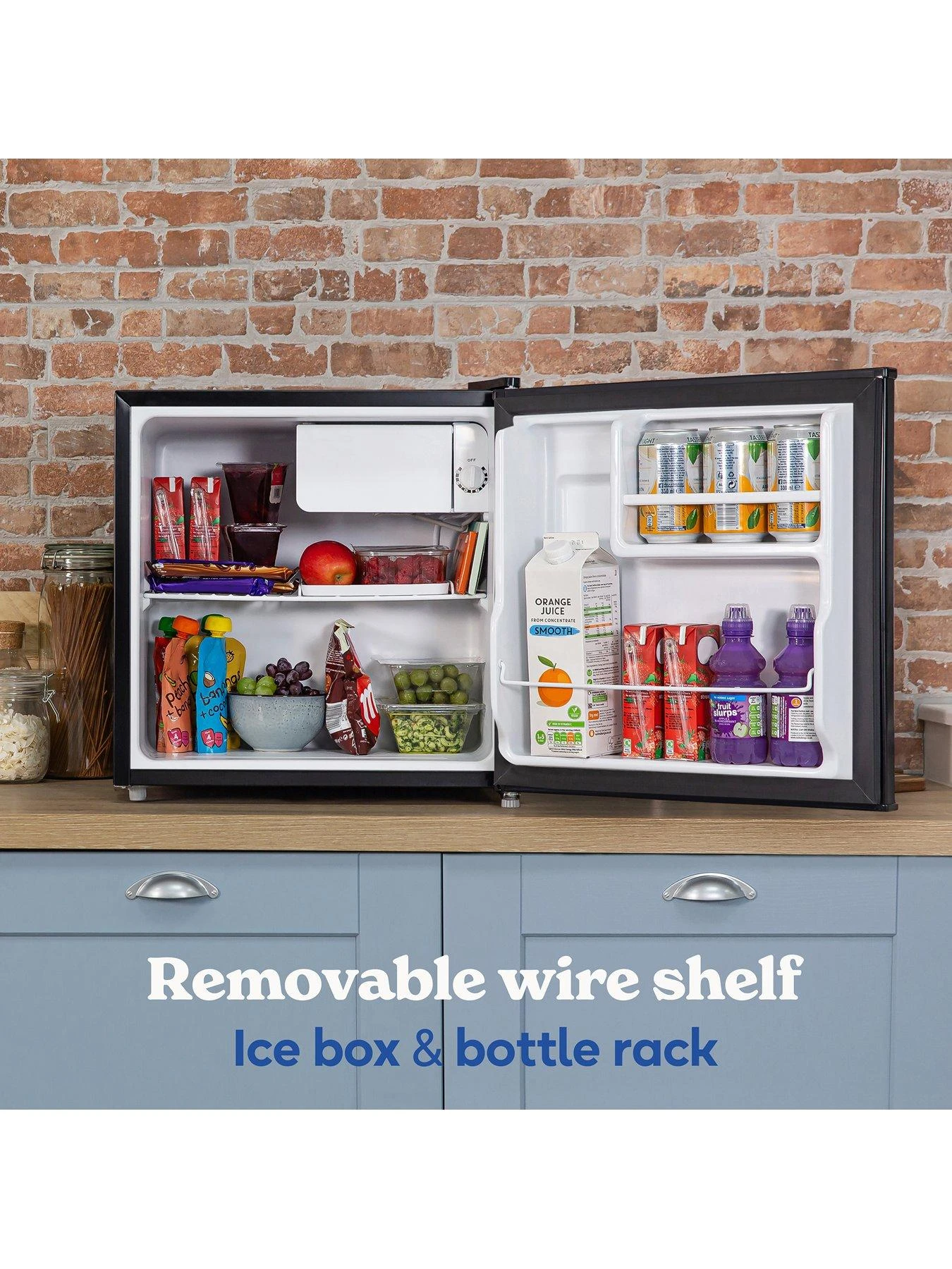 The versatile interior includes a removable wire shelf that gives you the option to store taller items, plus there’s a handy ice box and bottle rack. The manual temperature control means you can keep your drinks or snacks at the perfect temperature. Adjustable feet and a reversible door also ensure your fridge is stable on uneven surfaces and can fit anywhere.