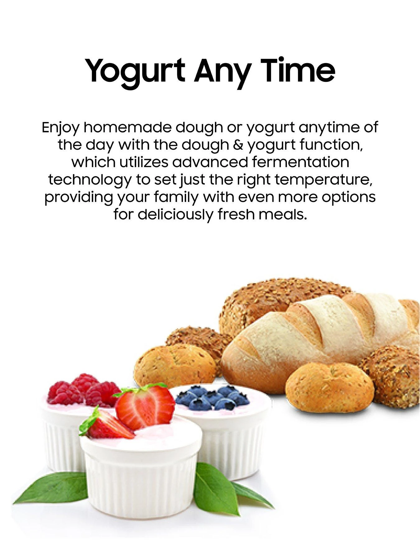 Enjoy homemade dough or yoghurt anytime of the day with the dough & yoghurt function, which utilises advanced fermentation technology to set just the right temperature, providing your family with even more options for deliciously fresh meals.