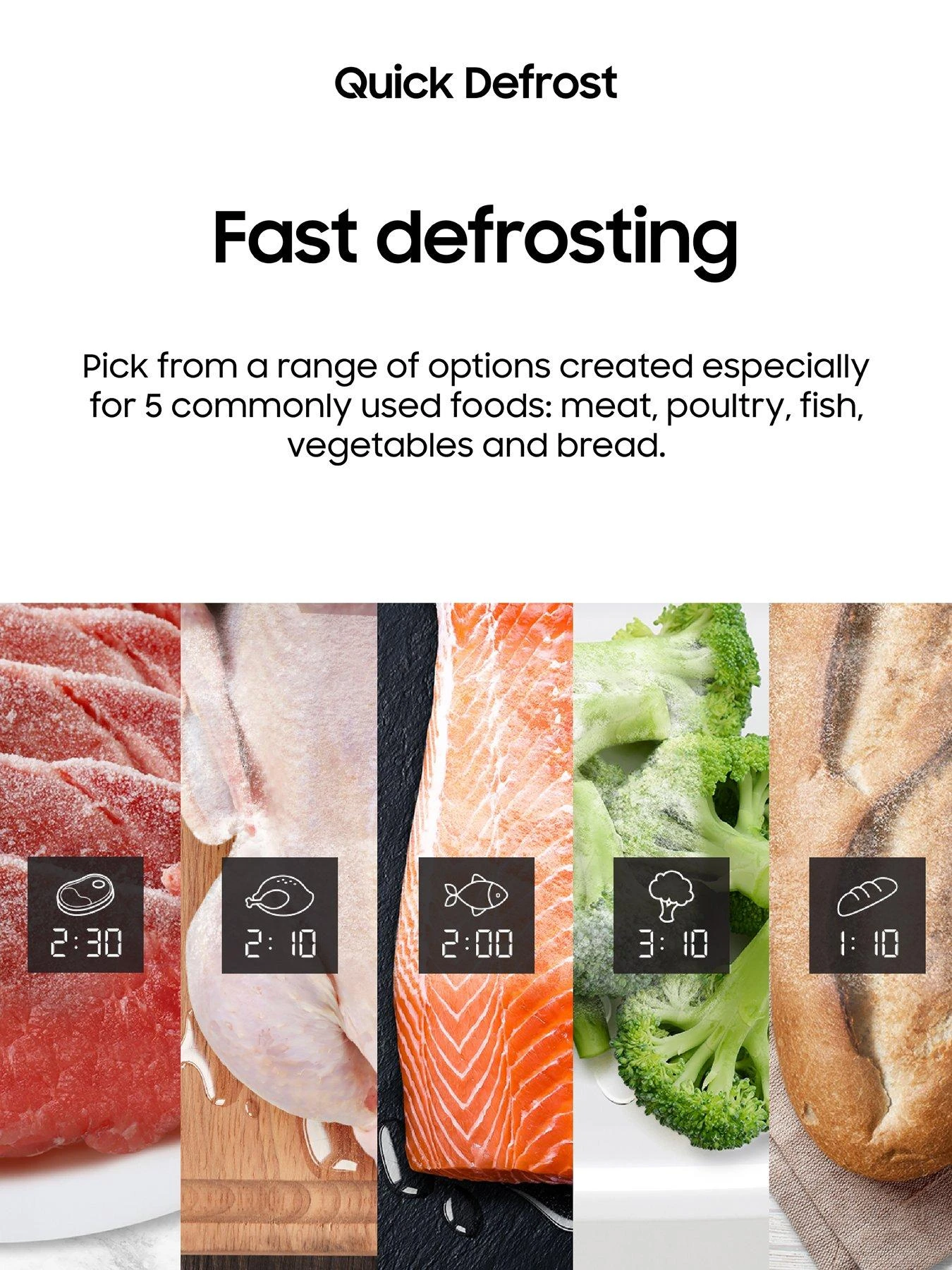 The Quick Defrost function defrosts food rapidly and evenly. Its automatic defrost algorithm calculates the correct defrosting time for 5 common food types, so it takes much less time to prepare ingredients.