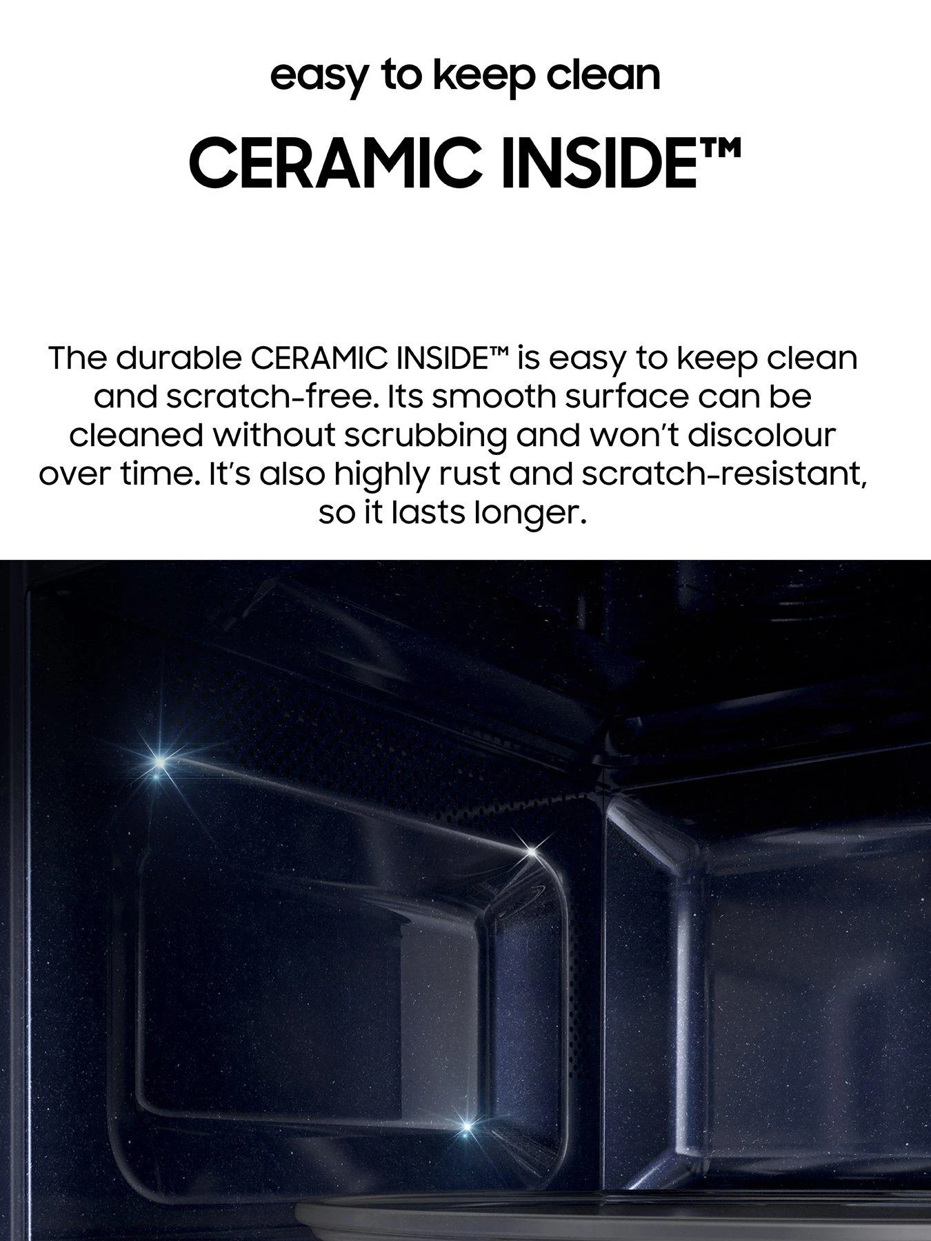 On top of all the handy microwave features, it’s ECO Mode lets you save on your energy bills too. Plus, it’s Ceramic Enamel Interior makes grease and oil super easy to clean with a quick wipe.