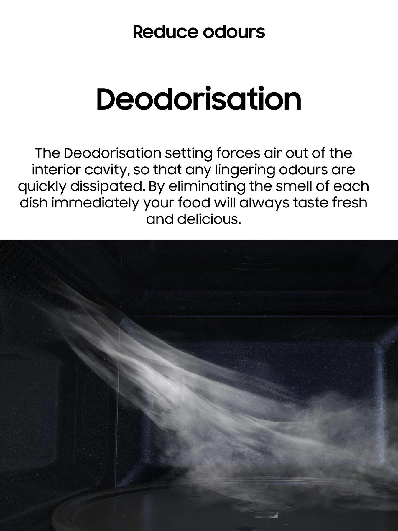 The Deodorisation setting forces air out of the interior cavity, so that any lingering odours are quickly dissipated. By eliminating the smell of each dish immediately your food will always taste fresh and delicious.