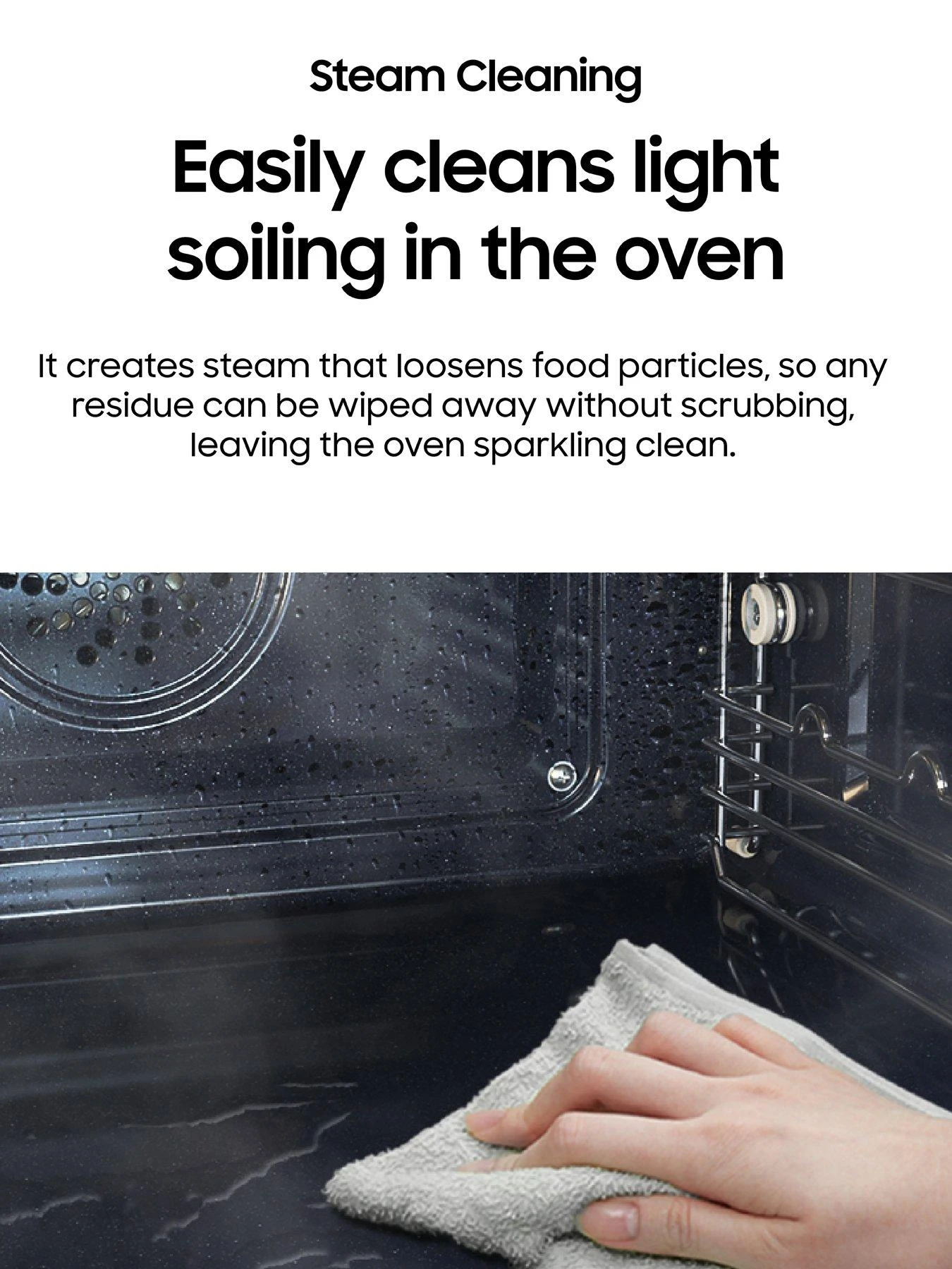 Get rid of light soiling much more easily. Compared to traditional oven cleaning, Steam Cleaning needs less time, power and effort to remove drips and splashes. It creates steam that loosens food particles, so any residue can be wiped away without scrubbing, leaving the oven sparkling clean.