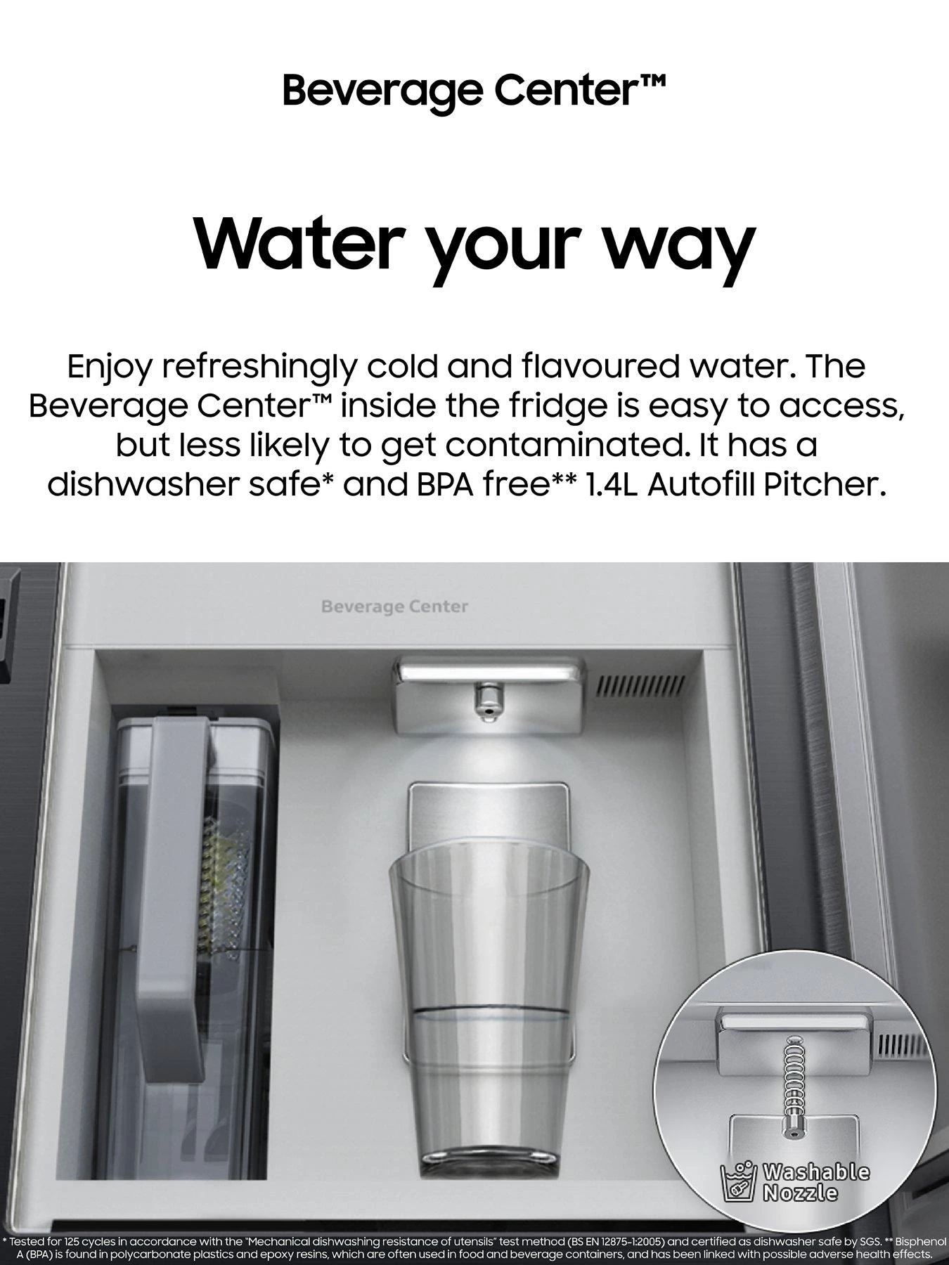 Enjoy fast and easy access to cold and flavoured water with the Samsung RS8000 with Beverage Center, can be infused with fruits and herbs, so it’s always ready to serve.