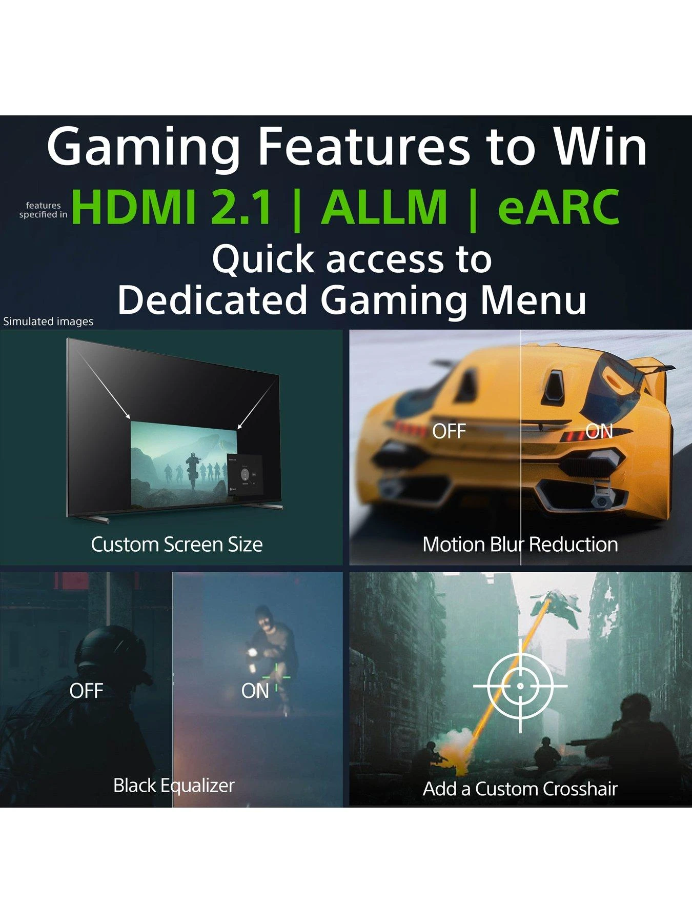 The dedicated Gaming Menu allows you to optimise your gaming performance – quickly. It includes Motion Blur Reduction, Black Equaliser, Crosshair, and Custom Screen.