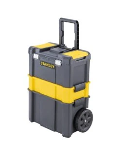 The Stanley STST1-80151 Rolling Workshop is a must-have piece of equipment for any tradesman. This toolbox is made up of 3 different parts to allow for optimum power tool and accessory storage. It contains a removable large 18″ toolbox with integral compartmental organiser trays for small parts and accessories, removable middle tote tray for the organized storage of smaller tools and accessories and an 18″ large bin for larger tools. Its 7″ wheels allow it to be easily transported from one area of the job site to another and its stackability functions allow each compartment to be used individually as well as a full rolling workshop