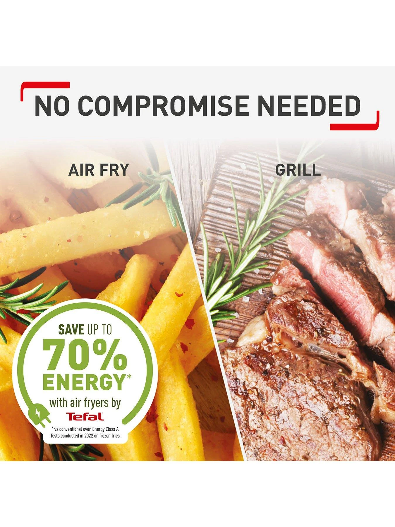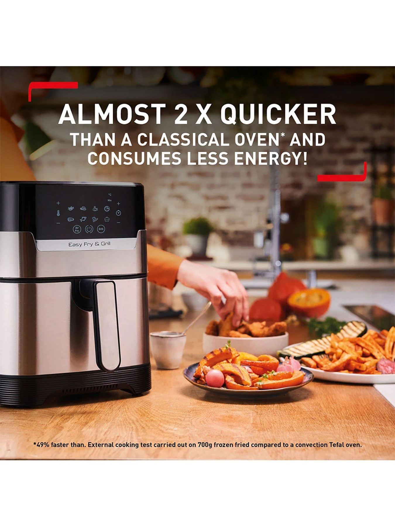**49% faster cooking with less energy than a conventional oven; external test cooking 700g of frozen French fries, compared to a Tefal convection oven