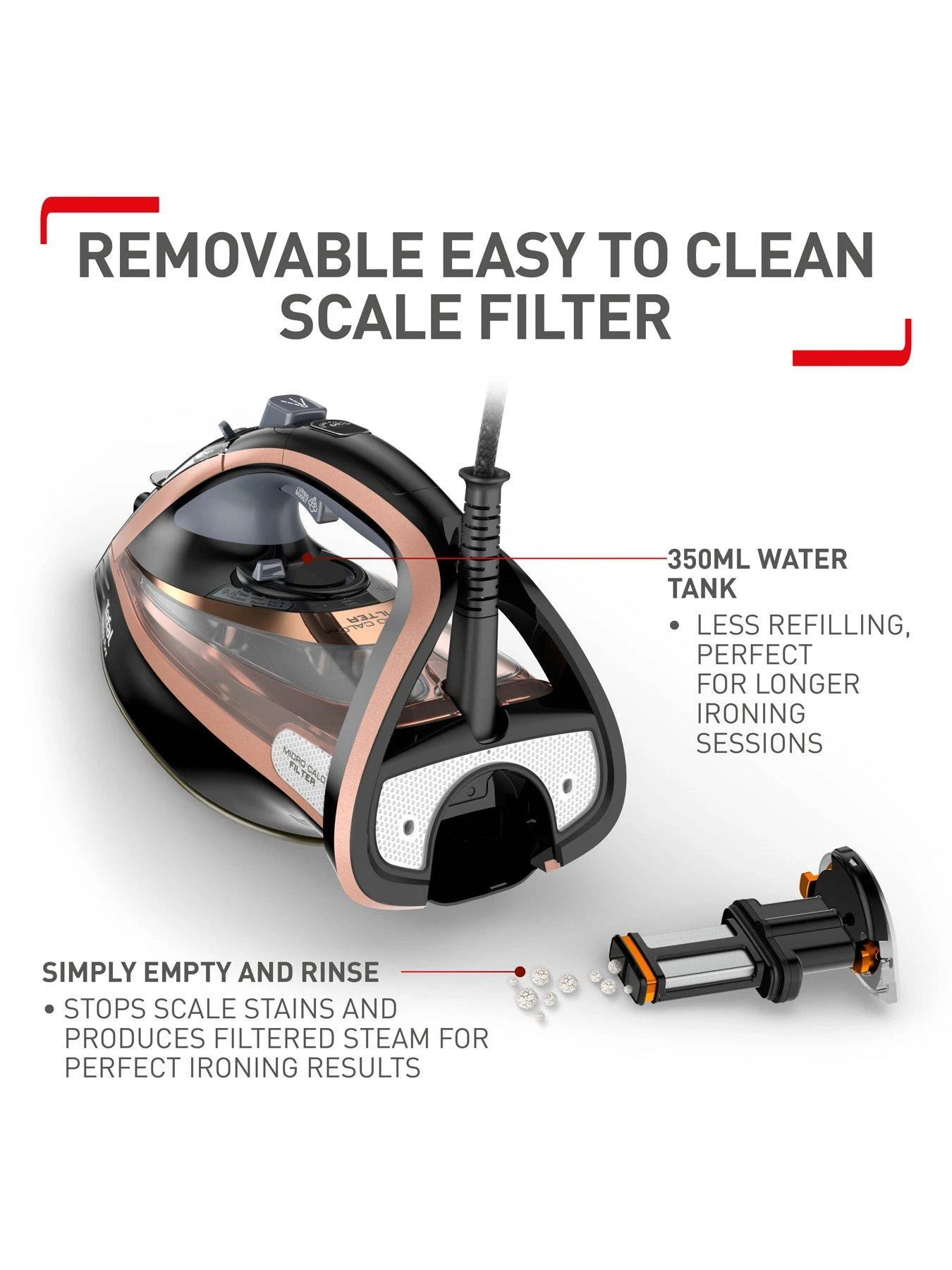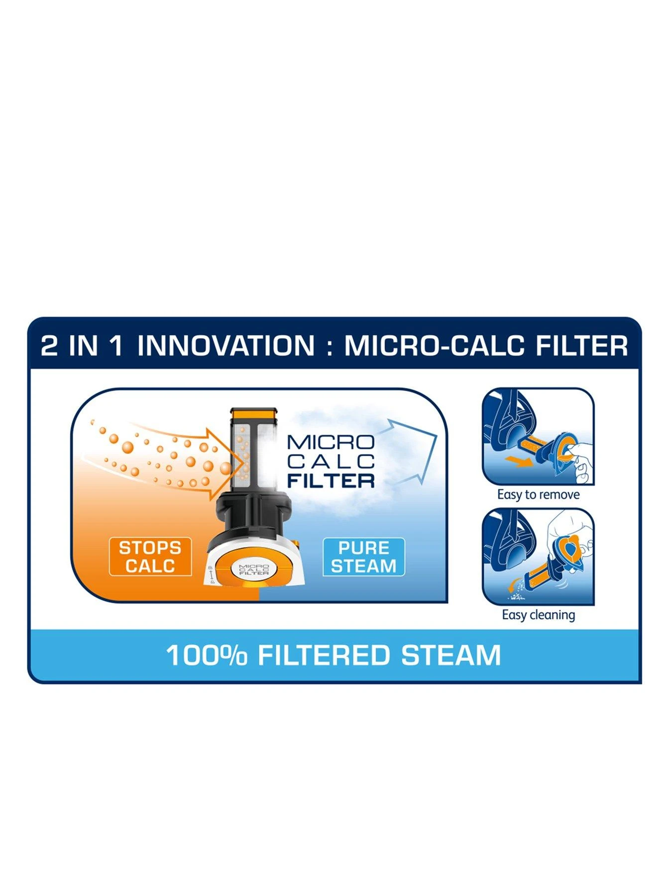 The brand-new Micro-Calc Filter system filters 100% of steam, providing exceptional calc management that helps prevent residue or stains, for outstanding ironing results with none of the worry.