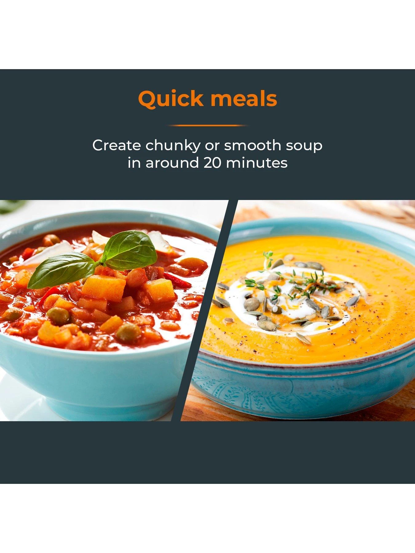 - QUICK MEALS: Easily create chunky or smooth soup in around 20 minutes – simply add your choice of ingredients and the soup maker does the rest